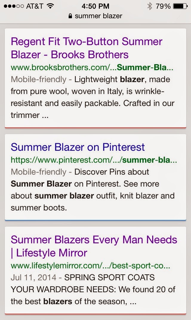 When we first wrote about Google's mobile friendly ranking signal, before the signal significantly effected rankings, we performed a basic search for summer blazer. Among the results, we noted, the first two had the "mobile-friendly" designation and the third did not: