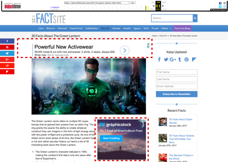 So your content above the fold should inspire a browser to scroll below the fold. Above the fold ads often inspire browsers to click away. The Sistrix study cites the case of Thefactlist.com, which lost 50% of its traffic post-Fred on Google UK. The layout before the update shows an ad-heavy page with two AdSense ads above the fold:
