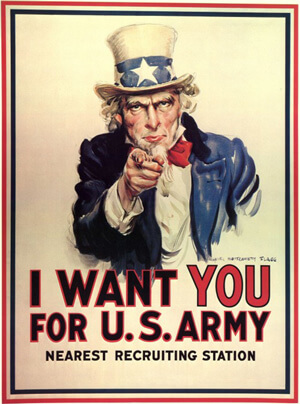 | Uncle Sam: In World War II, America's most famous "call to action." [Source] |